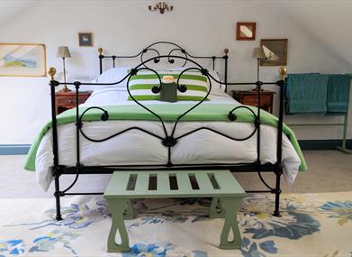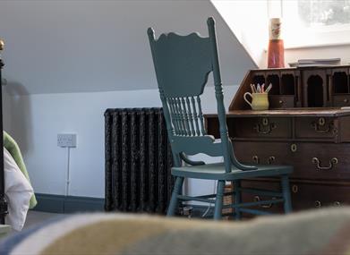 Upstairs, the charming, romantic bedroom is flooded with light from the large skylights and the original dormer window overlooking Main Street. The ornate antique French cast iron king-size bed, luxurious white cotton bedding, reading area and antique writing bureau make this the perfect place for relaxing. A full-length vintage cheval mirror allows guests to check their appearance when attending a wedding in nearby Orange Tree House, and critically, for brides and grooms to do so too, should they choose to stay in this very special place.