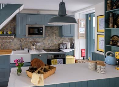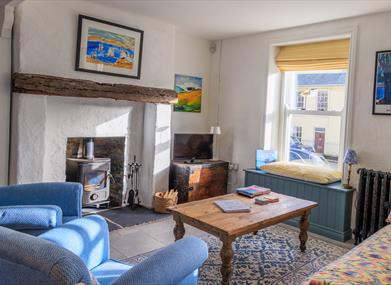 The open plan layout of the ground floor maximises sociability, allowing guests to take advantage of the new kitchen with its Belfast sink and modern appliances, while continuing to enjoy the company of their partner or visiting friends and family. There is a wood-buring stove in the living room which is separated from the dining area by a wooden beam and a line of vintage bricks set into the floor that indicate where a back kitchen was originally located.